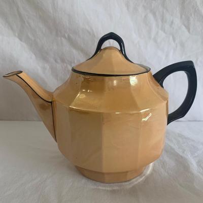 Tea set for six, marked Geschützt ‘Made in Germany’. The set is an iridescent caramel color with black rims. They appear to be porcelain and have a shiny glaze. The set includes six teacups and saucers, six 7.5â€D plates, an oval dish, a tea pot, and cream and sugar containers. Additionally there is another cream and sugar set by Noritake that has the exact same colors and shine. A tiny area is worn on the black of the tip of the teapot’s spout, but it is not chipped. No other chips or cracks noted. Shipping available. 2305 / 5545 sold -