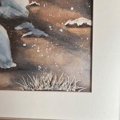 This signed watercolor print by Lois Dossey is titled “Winters Cloak: Demmon Bridgeâ€. Matted and mounted under glass in a silver colored metal frame which measures 14.4†x 20â€H. Shipping Available. Shipping can be costly. We suggest contacting our preferred local shipping provider, Postage Express, with dimensions and getting an estimate before bidding: (828) 670-5501 or shipping@postageexpressnc.com 3098 / 5545 sold -