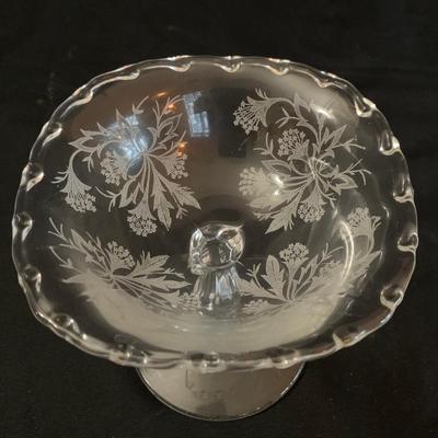 Three ornate glass serving dishes. The lattice bowl is 9.5â€D at the top, and 7.5â€H. The lidded dish has three separate pieces. They could be used separately if desired. The third dish has a base marked ‘Sterling by Frank M. Whiting Company, Weighted & Reinforced’. Shipping available. 3045 / 5545 sold -