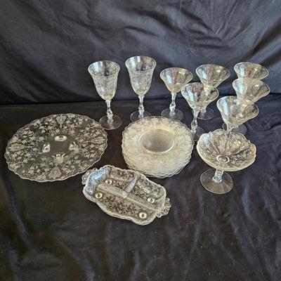 A gorgeous set of Fostoria glass dishes in their Heather Etch pattern. There are six goblets, twelve 7.5â€D plates, a pedestal dish, a curved handled dish, a cream and sugar set, and a pepper shaker. Two of the goblets have small chips in the rims. The pepper shaker has pepper residue inside. Everything else appears to be pristine and just needs to be washed. Shipping available. 3003 / 5545 sold -