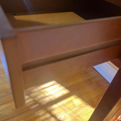 Solid wood nightstand with Richardson Brothers Company label. Measures 28” x 18” x 29.75”H. Table has two drawers with dovetail joints that have antique bronze color metal drawer pulls. Some small blemishes are seen on the top surface and some residue is found inside the drawers. There is also a small crack in the wood between the two drawers. This nightstand matches other bedroom furniture found in this auction. Local pickup only. 1157 / 4822 sold -