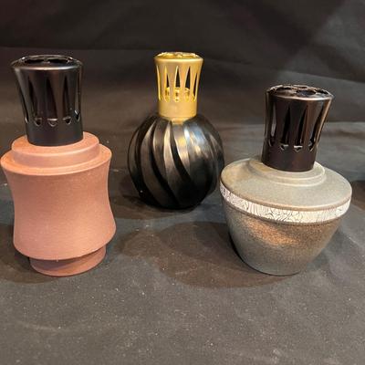 Three very pretty glass fragrance lamps. The largest has a rainbow of colors and is bell shaped. The mid sized lamp is amber and the smallest is an attractive rose colored glass with a pearlescent sheen. None have wicks. Largest lamp measures 4”D x 8”H. Multiple lots of this large fragrance lamp collection in this auction Shipping Available 803 / 4822 sold -