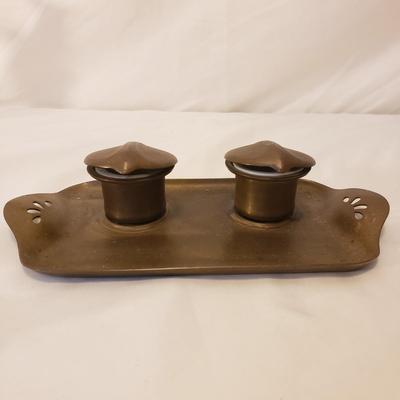 This lot features four different brass collectibles. The two brass candlesticks have an hourglass design and stand 7" tall. "Japan" is stamped at the bottom of both. The 18 inch candle snuffer has a wooden and brass handle. The brass bell with a wooden handle stands approximately 7" tall and the bell is approximately 3" wide. It definitely has a loud ring! The brass inkwell has two ceramic dishes that are removable. The tray is 8" x 4". It comes with an old ink bottle (no liquid ink contents). Shipping available. 1059 / 5844 sold -