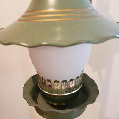This vintage double floor lamp has two lamps that can have both or one on at a time. The metal shades have a brass and green coloring to them. The lamp stands approximately 64" tall. One glass piece is a little wiggly in its slot. The lamp powered on when plugged in. Local pickup only. 1075 / 5844 sold -