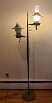 This vintage double floor lamp has two lamps that can have both or one on at a time. The metal shades have a brass and green coloring to them. The lamp stands approximately 64" tall. One glass piece is a little wiggly in its slot. The lamp powered on when plugged in. Local pickup only. 1079 / 5844 sold -