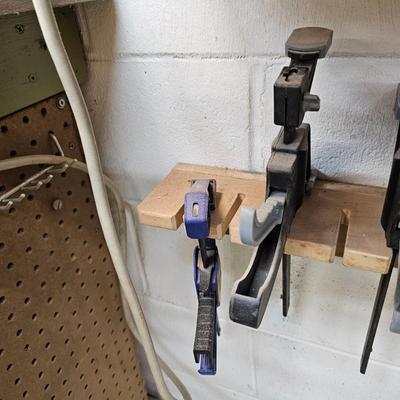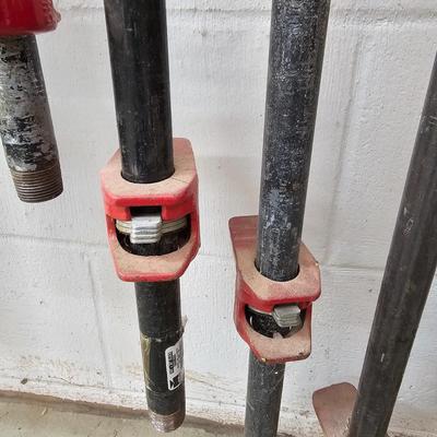 25+ items in this lot. Pipe clamps for use on larger projects to hold firm. Adjustable for length according to size of pipe. Spring slip ends and screw turn wheels to tighten. Most items are on 3/4" pipe. Pipes range from 24" to 72" in length. Wall mount rack not included. See photos for details. Local pickup only. 3076 / 5844 sold -