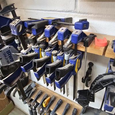 25+ items in this lot. Pipe clamps for use on larger projects to hold firm. Adjustable for length according to size of pipe. Spring slip ends and screw turn wheels to tighten. Most items are on 3/4" pipe. Pipes range from 24" to 72" in length. Wall mount rack not included. See photos for details. Local pickup only. 3075 / 5844 sold -