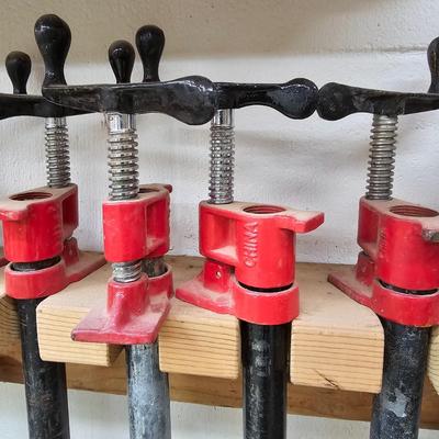 25+ items in this lot. Pipe clamps for use on larger projects to hold firm. Adjustable for length according to size of pipe. Spring slip ends and screw turn wheels to tighten. Most items are on 3/4" pipe. Pipes range from 24" to 72" in length. Wall mount rack not included. See photos for details. Local pickup only. 3080 / 5844 sold -