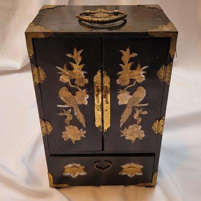 This auction is for two asian style jewelry boxes and an ornate divider screen. The black jewelry box is made from wood with metal accents and features five sliding drawers for storage. Some of the wooden decorations are peeling from the side. The red jewelry box splits in half revealing four sliding drawers. It is also made from wood with metal accents. The divider screen has four panels with unique decorations depicting plants and animals. The divider measures 24" x 18"H when open. Shipping available. 2946 / 4699 sold -