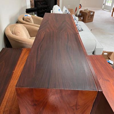 This gorgeous three piece set consists of 1) a credenza with one adjustable shelf in its left and in its matching right cabinet, 2) a glass door front shelf unit/book case, and 3) an open shelf unit. It appears to be solid rosewood with sleek black handles on the credenza. The glass shelf unit has the same handles and three adjustable shelves on left and on the right. The open shelf unit has fixed shelves. Credenza measures 45” x 23” x 21”H. Shelf unit measures 45” x 12” x 45”H. Fixed shelf unit measures 45” x 12” x 23”H. 89" total height. This auction has other lots with matching items - Rosewood sideboard and a dining table with chairs. Local Pickup Only. Winning bidder must bring assistance to help move and load this item due to its weight and/or size. 436 / 4699 sold -
