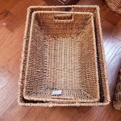 This nine storage basket lot will get you organized with style! There are new baskets in this lot see pictures. The first two stackable baskets have a sturdy wire rim and base. The largest one measures 16" x 12" x 7"H. The waste basket or plant basket measures 12" x 12"H. The four matching cube baskets also have a sturdy wire rim and base. Local pickup only. 953 / 6765 sold -
