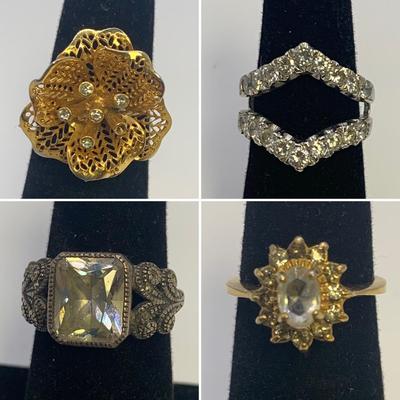 A variety of seven rings. All have clear sparkling gemstones. The gold flower is stamped ‘PSP 14K’. It is missing one small gemstone. The ring enhancer ring with the two bands is marked ‘14K’. One ring that fits perfectly inside the ring enhancer is missing its main stone. It was two gemstones in the band that both tested positive as diamonds with our diamond tester. Its band has hallmarks stamped but they are illegible. Please see photos for hallmarks on the other rings and all sizes. One is marked 925, others are illegible. All sales are final. No returns or refunds. Please bid accordingly. Shipping available. 1760 / 6765 sold -