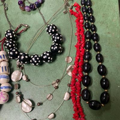 This lot contains a large fun and eclectic variety of jewelry. Most items are necklaces, and there are also over 10 bracelets, a watch, and a couple pairs of earrings for pierced ears that match necklaces. All sorts of different materials are found, like stone, glass, shell, plastic, wire, and more. Necklaces are many different lengths. Please see photos for inventory. The charm bracelet has a couple charms that have a Sterling hallmark. All sales are final. No returns or refunds. Please bid accordingly. Shipping available. 2195 / 6765 sold -