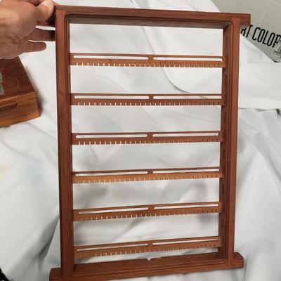 Get your jewelry organized! This lot contains three hanging jewelry bags with compartments on both sides! The two matching tan ones measure 17" x 31"H and have 80 pockets each! There are two wire racks that can also hang. The silk like material bag with oriental design can roll up for when you travel. The wooden earring rack measures 13" x 1" x 17"H. Finally, is a wooden jewelry box with a removable tray. Shipping available. 2123 / 6765 sold -