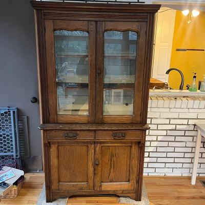 Lot includes an oak step back cabinet with glass doors and two pegged drawers with cabinet underneath. Cabinet measures 39” x 20” x 72.5”H. There is a key included but it does not open the lock. Local pickup only. Winning bidder must bring assistance to help move and load this item due to its weight and/or size. 2916 / 6765 sold -