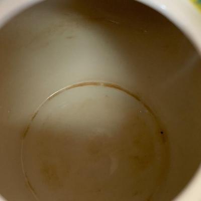 A collection of seven pieces of handmade pottery. There are two matching green mugs, a cylindrical green vessel, a teapot, a pitcher, a bowl, and a bacon cooker. All but one of the pieces (green cylinder) are signed or marked by the artist. For reference, the bowl is approximately 7”D x 3.25”H. The pitcher has some cracks at the base that don’t appear to affect its integrity (might just be cracks in the glaze); it also has a small spot of purple paint. Shipping available. 3115 / 6765 sold -