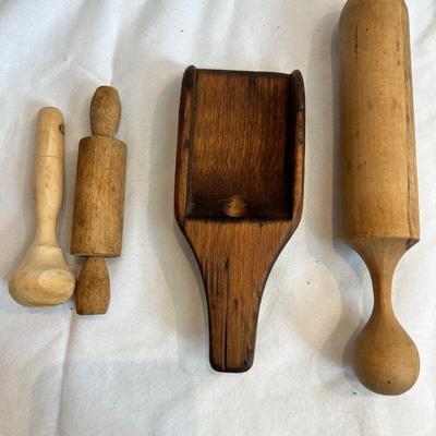 A large assortment of vintage kitchen, tools and utensils. Three large serving spoons and one metal ladle as well as four serving forks measure approximately 13”L each. Five Metal rotary egg beaters measure each approximately 3” x 4” x 13”H. Three wooden handled dough blenders are each approximately 4.5” x 1.5” x 5”H. Two flour sifters, the larger one is 4.5”D x 6”H. Two metal hair clippers measure approximately 2” x 5”L each and a metal razor which is 1.75”W x 3.5”L. The milk can measures approximately 4”D X 8”H. See photos for more details on all items included. Shipping available. 388 / 6765 sold -