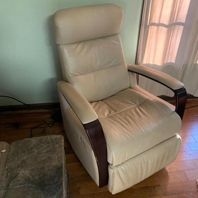 IMG Norway brand electric power recliner with swiveling base features beige colored leather and wood-based armrests. In its upright position the chair measures 30” x 32” x 38”H with a 19” seat height. On the side of the chair there are simple touch buttons to recline or incline the chair. Both worked when touched when chair was plugged in. The leather has some light stains/spots and there is some wear on the wood. Local pickup only. Winning bidder must bring assistance to help move and load this item due to its weight and/or size. It’s located on the main floor and will need to be moved down the three steps at the house entry. 344 / 6765 sold -
