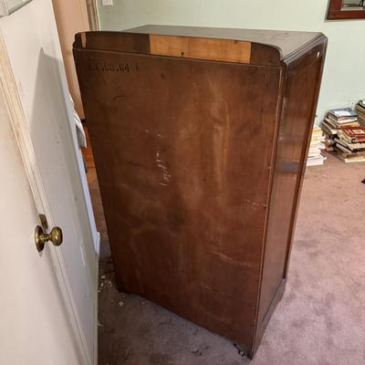 Lot includes one wooden art deco style waterfall dresser with four drawers and casters. The dresser has a few signs of wear including watermarks. The side of the dresser has residue from a sticker that could be removed. See pictures for signs of wear. The dresser has dovetailing on the drawers and brass handles. It measures 30” x 18” x 51”H. Local pickup only. Winning bidder must bring assistance to help move and load this item due to its weight and/or size. Dresser is located on the main floor and will only need to be moved down a few entry steps. 3978 / 6765 sold -