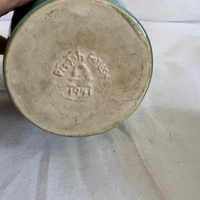 Five lovely pieces of glazed pottery includes pottery pieces from much loved local pottery makers Pisgah Forest and North state; each very unique. The pale blue and green Pisgah Pottery vase measures approximately 4”D x 7”D and the pale green vase measures approximately 6”D x 5”H. The rough glazed orange bowl with two handles measures 5.25”D x 2”H and is ideal for nuts or candy. The small red handmade by North State Pottery vase with four flower bud holes measures approximately 3.5”D x 3.75”H and the tall teal blue and almond colored glazed jar also handmade by North State Pottery measures approximately 3”D x 7.25”H. Shipping available. 412 / 6765 sold -