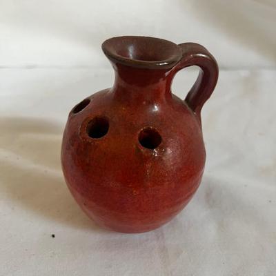 Five lovely pieces of glazed pottery includes pottery pieces from much loved local pottery makers Pisgah Forest and North state; each very unique. The pale blue and green Pisgah Pottery vase measures approximately 4”D x 7”D and the pale green vase measures approximately 6”D x 5”H. The rough glazed orange bowl with two handles measures 5.25”D x 2”H and is ideal for nuts or candy. The small red handmade by North State Pottery vase with four flower bud holes measures approximately 3.5”D x 3.75”H and the tall teal blue and almond colored glazed jar also handmade by North State Pottery measures approximately 3”D x 7.25”H. Shipping available. 420 / 6765 sold -