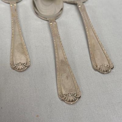 This lot of Rogers Bros silver plated flatware for four included eight of the following: dinner knives, all of the spoon sets pictured, and medium sized forks. There are six dinner forks, seven small dessert forks, four butter knives, and one of each serving utensil pictured. The wooden box storing the silverware is an anti-tarnish silverware container. There are signs of wear including tarnish due to age - see pictures included. Shipping available. 490 / 6765 sold -