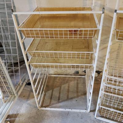 These two Elfa wire rack systems measure 22" x 21" x 41"H. The two racks can be stacked and fitted together, see photos. One rack has five wire baskets, the other has three baskets. Some baskets have a tan clear thick liner so items do not fall through. The four in cabinet wire racks help in utilizing large cabinets. The largest one measures 18" x 12" x 9"H. The two tired wire cabinet insert can be mounted inside a cabinet. Local pickup only. 5082 / 6765 sold -
