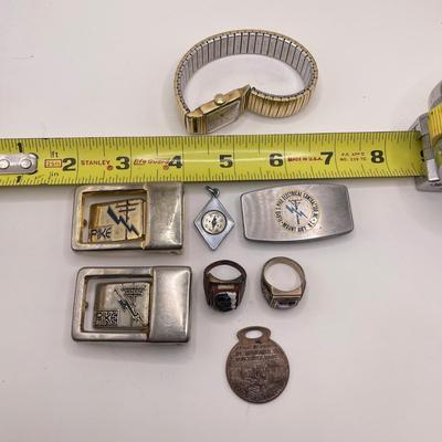 A nice collection of belt buckles, money clip, rings, a watch and compass. The 1934 ring is very heavy, while the Romanesque cameo ring is a much lighter metal. Lot features three Pikes fashions- two belt buckles and a money clip-pocket knife combo marked Zippo. The Elgin watch is marked gold-filled with 12-25-‘40 etched on it, it is currently not working. Lastly a small diamond shaped compass and a vintage Paul Revere Life Insurance token. See images. All sales are final. No returns or refunds. Please bid accordingly. 5131 / 6765 sold -