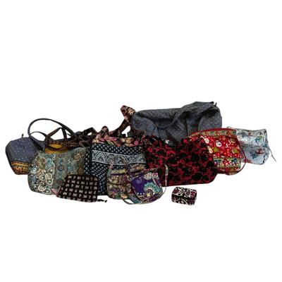 This lot includes sixteen Vera Bradley pieces, including totes, wallets, travel duffles, lunchbox, and a reusable grocery bag. One of the smaller bags has a small stain - see picture included. The largest totes are the first two pictured individually - they measure 28” x 17” x 29”H. Shipping available. 870 / 6765 sold -