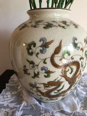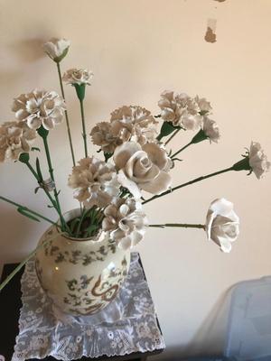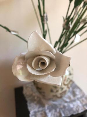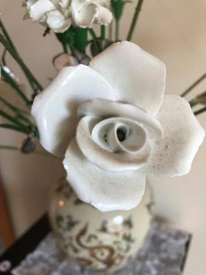 As shown; these items are in decent condition and well loved, but are ready for their new home. This lot is HEAVY as the case is filled with pebbles to support the weight of the bone china flowers. Eighteen flowers in total, some have chips or breaks, but should clean up well (with caution). All flowers contain silver tags that say “Heathcoth Hall, Handcrafted Bone China, Made in England”. The vase is in good condition and marked “Andrea by Sadek, Made in Japan”. The vase has no visible defects aside from some crazing (shown). 100 / 2652 sold