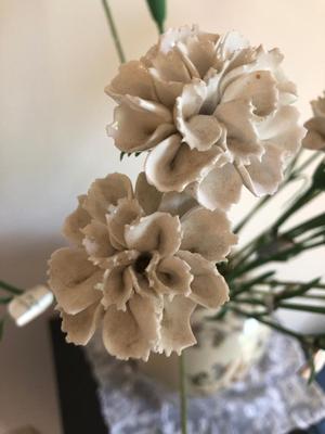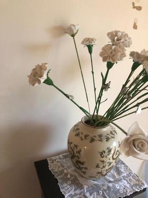 As shown; these items are in decent condition and well loved, but are ready for their new home. This lot is HEAVY as the case is filled with pebbles to support the weight of the bone china flowers. Eighteen flowers in total, some have chips or breaks, but should clean up well (with caution). All flowers contain silver tags that say “Heathcoth Hall, Handcrafted Bone China, Made in England”. The vase is in good condition and marked “Andrea by Sadek, Made in Japan”. The vase has no visible defects aside from some crazing (shown). 97 / 2652 sold -