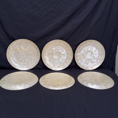 Bohemian decor includes a wooden tray with glass liner, two flameless candles with capiz shell-like leaded candle holders and a set of five glass and wood coasters. The majority of the coaster set is signed Lopez and appears to be reverse hand painted glass in a wood coaster frame. The complementing box also appears to be reverse painted glass and wood, we did not find a signature on the box. Coasters show a little wear on the corners of the wood. Coasters are each 4.25”SQ, the tray is 17” x 11” x 3.5” and the candle shades are 7” tall. There appears to be candle wax on the tray. See images. Shipping available. 1801 / 3707 sold -