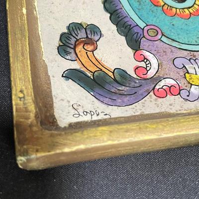 Bohemian decor includes a wooden tray with glass liner, two flameless candles with capiz shell-like leaded candle holders and a set of five glass and wood coasters. The majority of the coaster set is signed Lopez and appears to be reverse hand painted glass in a wood coaster frame. The complementing box also appears to be reverse painted glass and wood, we did not find a signature on the box. Coasters show a little wear on the corners of the wood. Coasters are each 4.25”SQ, the tray is 17” x 11” x 3.5” and the candle shades are 7” tall. There appears to be candle wax on the tray. See images. Shipping available. 1805 / 3707 sold -