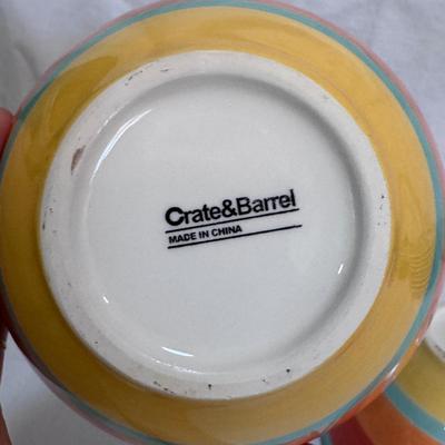 This lot includes eight Crate & Barrel small plates, two multi-colored striped bowls by Crate & Barrel, three mugs (two brown, one light blue) by Crate & Barrel, and four drinking glasses with tiny bubbles and blue rims. Two of the mugs are stamped with Crate & Barrel. The other mug appears to have been stamped, but it has since worn off. The small plates individually measure 6” x 1.5”H. Shipping available. 2275 / 3707 sold -