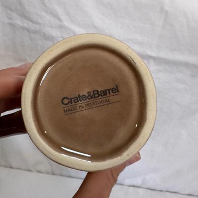 This lot includes eight Crate & Barrel small plates, two multi-colored striped bowls by Crate & Barrel, three mugs (two brown, one light blue) by Crate & Barrel, and four drinking glasses with tiny bubbles and blue rims. Two of the mugs are stamped with Crate & Barrel. The other mug appears to have been stamped, but it has since worn off. The small plates individually measure 6” x 1.5”H. Shipping available. 2265 / 3707 sold -