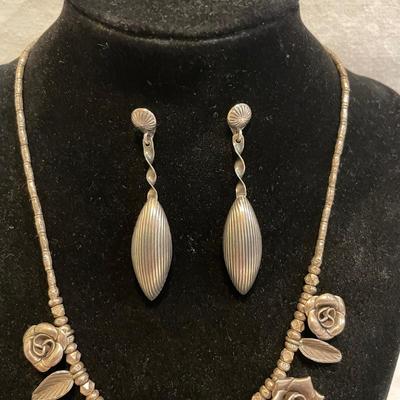 Three pairs of long silver dangle earrings for pierced ears, a rose necklace and petite pendant. Most items have a look of sterling, but the only known sterling marking is on the two-toned gold/silver colored pair. Earrings have two backs included. See photos for measurements. Shipping available. All sales are final. No returns or refunds. Please bid accordingly. 2820 / 3707 sold -