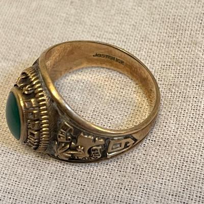 Three gold rings. Lot includes a 1964 Coronado class ring with a jade colored stone marked Jostens 10K and monogrammed. A thin textured band with a 14K marking and an unmarked gold colored wire ring with a centerpiece of gold beads and a larger piece akin to an iridescent grey freshwater pearl. Shipping available. All sales are final. No returns or refunds. Please bid accordingly. 2840 / 3707 sold -
