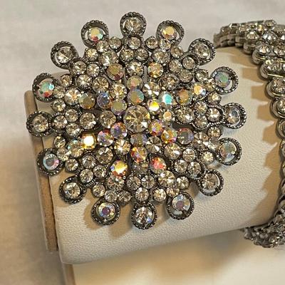 Three glitzy bracelets, a sunburst brooch/pendant and vintage style clip earrings. The earrings and the silver bracelet with the fold-over clasp are marked Trifari. The Trifari bracelet is missing four rhinestones. The 2”D sunburst brooch and the bracelet with the purple stones and gems do not appear to be marked. The stretch bracelet has all of its rhinestones and is marked Made in Japan. See images. Shipping available. All sales are final. No returns or refunds. Please bid accordingly. 2851 / 3707 sold -