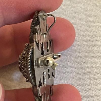 Two Jerusalem cross brooches, one with illegible silver marking and the larger one being stamped Silver 935. Also included is a petite unmarked silver and clear gemmed pendant plus a long pin with a rhinestone and onyx colored centerpiece. See images for measurements. All sales are final. No returns or refunds. Please bid accordingly. Shipping Available 2940 / 3707 sold -