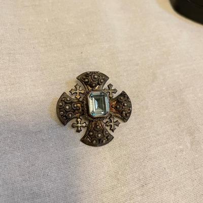 Two Jerusalem cross brooches, one with illegible silver marking and the larger one being stamped Silver 935. Also included is a petite unmarked silver and clear gemmed pendant plus a long pin with a rhinestone and onyx colored centerpiece. See images for measurements. All sales are final. No returns or refunds. Please bid accordingly. Shipping Available 2941 / 3707 sold -