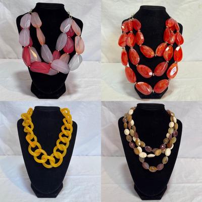 This lot includes four lucite statement necklaces. You’ll find a red triple layered lucite necklace, an earth-toned triple layered beaded necklace, a yellow lucite chain-link necklace, and a purple and pink lucite necklace. The yellow necklace is the longest that measures 18” long. Shipping available. All sales are final. No returns or refunds. Please bid accordingly. 2930 / 3707 sold -