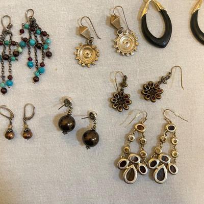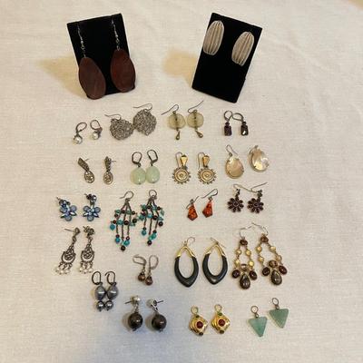 20 pairs of mostly dangle earrings for pierced ears plus two pairs of stud accessories to dazzle up your favorite pair. Some earrings have markings, all known markings are shown in photos. Very few earrings come with backings. Materials include stone, wood, amber, metal, resins and more. See images. Shipping available. All sales are final. No returns or refunds. Please bid accordingly. 3000 / 3707 sold