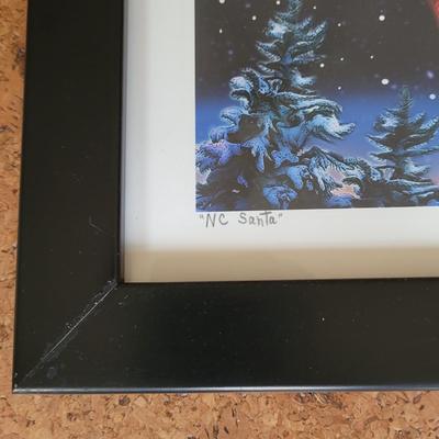 This auction is for an original print titled "NC Santa" by Asheville local artist Daryl Slaton. It depicts Santa Claus using cardinals to fly over pine trees with a starry sky as the background. This piece is under glass in a wooden frame. It is titled and signed in pencil. Includes descriptive greeting card on the backside explaining symbols in the piece.. Item measures 22" x 1" x 26"H. Shipping available. Shipping can be costly. We suggest contacting our preferred local shipping provider, Postage Express, with dimensions and getting an estimate before bidding: 828-255-9250 or shipping@postageexpressnc.com 3098 / 3707 sold -