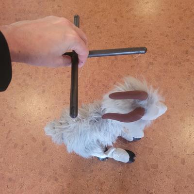 Sunny Toys billy goat marionette. Grey billy goat with brown horns and black hooves. Larger 38" model. Features shaggy grey hair. Includes handle and has all strings attached. Marionette has an airplane-type control which, when rocked side-to-side like an airplane dipping its wings, causes the puppet to walk or dance. Shipping available. 3203 / 3707 sold -