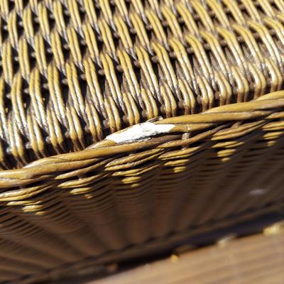Lot includes two Lloyd Flanders brand faux rattan Wicker loungers with removable cushions and protective covers. Each measure approximately 33” x 53” x 35"H with a 19"H seat height. The frames and cushions have signs of wear. Per the homeowner, these were purchased from Tyson Furniture. Please see photos for details. Local Pickup Only 3316 / 3707 sold -