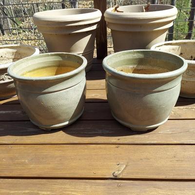 Lot includes six large outdoor pots that are made to look like ceramic or cement but are lightweight composite. The two largest pots have dirt in them. These were left as there may be something growing. Please discuss with a staff member should you choose to dump them. These pots measure 15"H x 16"D. Some chips on the green pots. Please see photos for details. Local Pickup Only 3324 / 3707 sold -