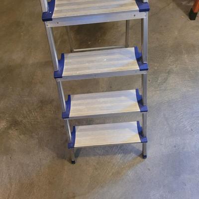 A pair of folding work ladders. The larger of the two is an 8' Husky brand ladder featuring non-slip rubber legs, wide metal steps, and hard plastic top. The smaller ladder is a Leifheit brand folding type. The top step is 43" off the ground but measures 68" top to bottom. Local pickup only. 3425 / 3707 sold -