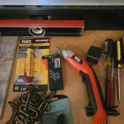This lot is a variety of tools. Some of the main items include hammers, squares, level, chisels, knives, screwdrivers, snips, voltage testers, brushes, rivet tool, painting supplies, chains, tape measure, steel wool, and buckets. Tool shelf sold in a separate lot. Local pickup only. 3491 / 3707 sold -