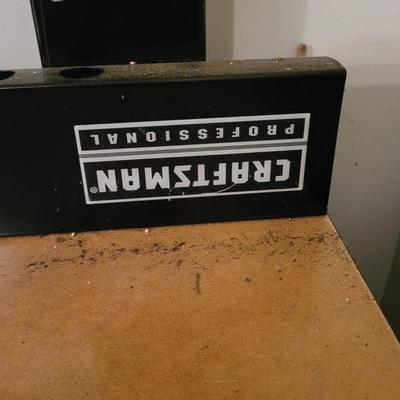 A Craftsman brand tool bench and peg board. The bench is made from metal and wood. Bench measures 60" x 26" x 84"H with peg board. Table itself sits 41" off the ground. Includes hooks and small racks for peg board. Also includes two plastic slide-out shelves and original paperwork. This item is located in the garage and has access from the driveway. Local pickup only. Winning bidder must bring assistance to help move and load this item due to its weight and/or size. 3479 / 3707 sold -