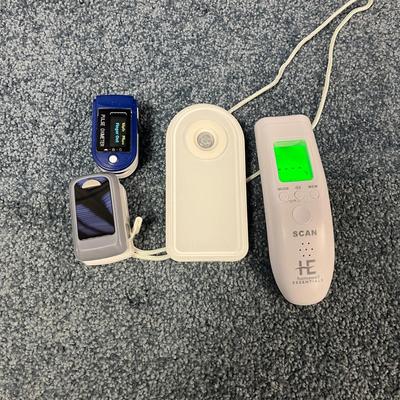 Lot includes five suction cup handles, Homedics vibrating and heated chair cover, metal cane, Drive bed brace, thermometer, emergency flashlight and two pulse oximeters. All electrical items powered on when plugged in. One pulse oximeter appears to need batteries. Bed brace measures 8” x 6” x 20”H. Local Pickup Only 2655 / 2902 sold -
